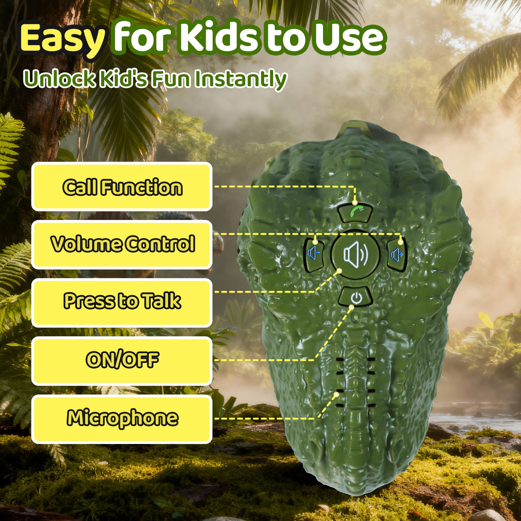 - Dinosaur Walkie Talkies for Kids: Our kids walkie talkie is designed in an exciting dinosaur shape with a cleverly hidden initiate-talk button and mic in the dino head—allowing kids to fully immerse themselves in role-play. These dino walkie talkies turn ordinary days into wild adventures